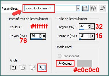 Effets, Effets d'image, Enroulement de page, cliquez sur Paramètres et sélectionnez le Paramètre nuovo-look-param1