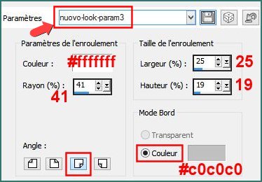 Effets, Effets d'image, Enroulement de page, cliquez sur Paramètres et sélectionnez le Paramètre nuovo-look-param3