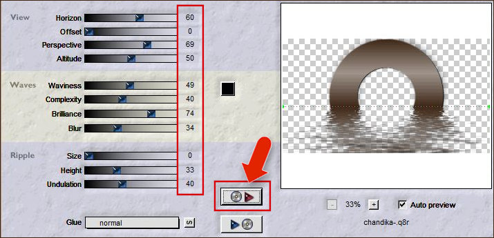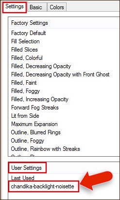 - Cliquez sur la petite flèche rouge, dans la fenêtre qui s'ouvre, sélectionnez le dossier dans lequel vous avez placé le preset chandika-noisette.q8r et appliquez ce preset