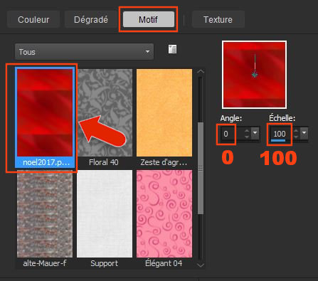 - Dans la palette Styles et textures, cliquez sur Motif, cliquez sur l' image que vous venez de sélectionner