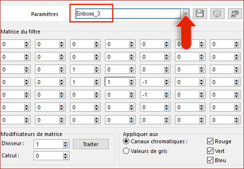 - Effets, Filtre personnalisé, Emboss 3, sélectionner le Preset Emboss 3 dans la liste déroulante