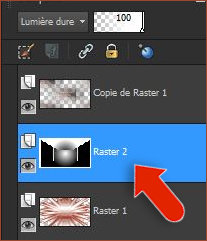 - Double-clic sur le calque Raster 2, Mode Mélange : lumière dure et Opacité à 100%
