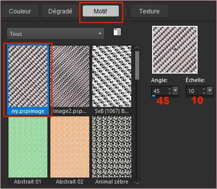 - Ouvrir la palette Styles et textures : cliquez sur Motif puis cherchez l'image de votre travail à l'écran sur les miniatures à gauche.