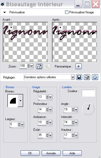 Effets, Effets 3D, Biseautage intérieur avec les mêmes réglages