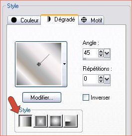 38- Outil, Baguette magique , mêmes réglages qu'à l'étape 26 Sélectionner l'angle blanc 39- Outil, Pot de peinture, Remplir de dégradé Métalique (réglages étape 12)Ne pas désélectionner !