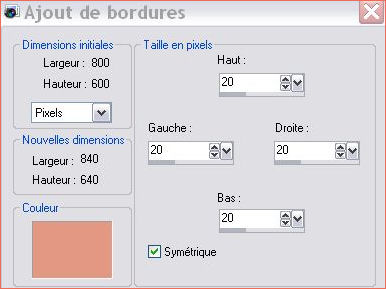 Placer plus haut comme sur l'exemple 27- Image, Ajouter des bordures, couleur #e39883  28- Outil, Baguette magique  Sélectionner la bordure 29- Effets, Effets 3D, Découpe couleur #000000  Sélections, Désélectionner tout 30- Image, Ajouter des bordures, symétriques de 50 pixels, couleur #ffffff 31- Outil, Baguette magique , mêmes réglages qu'à l'étape 26 Sélectionner la bordure