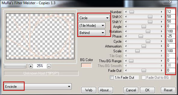 25- Outil, Pot de peinture, remplir la sélection de #f7dbcd 26- Effets, Effets de bords, Accentuer 27- Effets, Mura's Meister Copies, Encircle