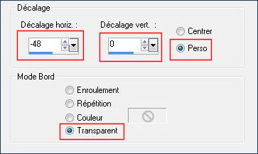 9- Sélections, Désélectionner tout 10- Calques, Dupliquer 11- Calques, Dupliquer 12- Palette des calques, sur Eclaircir 13- Se replacer sur le calque Raster 2 14- Effets, Effets d'image, Décalage
