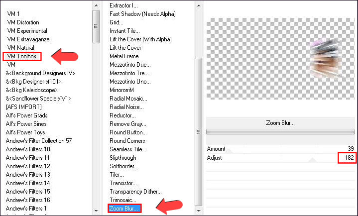 30- Calques, Dupliquer 2 fois ! 32- Sur le calque, Copie (2) de Raster 5, Effets, VM toolbox, ZoomBlur
