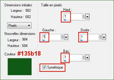 61- Image, Ajouter des bordures, Symétriques, de 40 pixels, couleur #FFFFFF 62- Image, Ajouter des bordures, Symétriques, de 1 pixel, couleur #135b18 63- Signez votre travail 64- Enregistrez en JPG et Redimensionnez si vous le souhaitez. -------------------------------